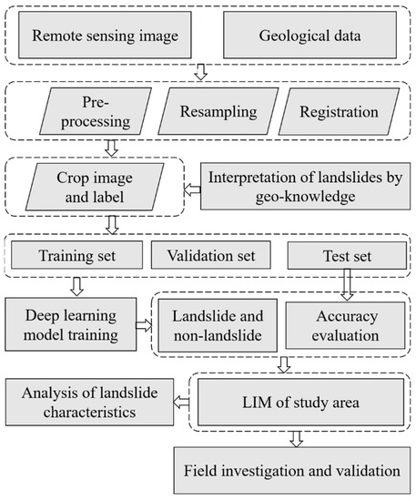 In the first step, remote sensing images and geological data were preprocessed, including registration and resampling to the same resolution. Remote sensing images were preprocessed by atmospheric correction and radiometric correction. Landslides and non-landslides interpreted by geological knowledge were labels trained by deep learning models. Remote sensing images and labels were cropped in one-to-one correspondence. Images and corresponding label pairs were divided into training set, validation set, and test set. In the second step, images and labels were fed into the deep learning model for training. The network was mainly tuned by the training set. The loss value after each training iteration was obtained by the validation set to evaluate network quality. The test set was used to evaluate the accuracy of the trained network.