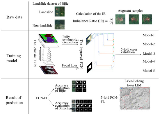 This study aimed to address sample imbalance in LIM using deep learning algorithm in terms of the data source, training model, and prediction result optimization. The landslide dataset released by Ji et al. [28] in Bijie City, Guizhou Province, was used as the training data. First, the imbalance ratio (IR) of the dataset was reduced by data augmentation. Then, an improved fully convolutional network with focal loss (FCN-FL) based on a fully convolutional network (FCN) [41] was adopted to increase the feature level and reduce the impact of background loss values, which were easily classified. Finally, an FCN-FL model trained by 5-fold cross-validation (FCN-FLK) was used to obtain LIM in Fa’er and Jichang. The classification method for an imbalanced simple landslide was examined in terms of the data source, loss function, and prediction outcome.