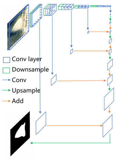 Fully convolutional network is an end-to-end semantic segmentation network, which uses VGG16 as the backbone network and implements network training through feed-forward calculation and backpropagation. In Figure 4, the blue box represents the convolution layer of the learning sample features. The green box represents the lower sampling pooling layer. The green arrow is the upsampling operation, which matches the size of the feature graph with that of the upper level through upsampling and adds the data through the overlay operation of the orange arrow. The blue arrow represents the prediction result of the full-convolution operation. The prediction results of different depths were fused. To increase the feature level of the prediction, the convolution features of the first and second downsampling were added to the final prediction image.