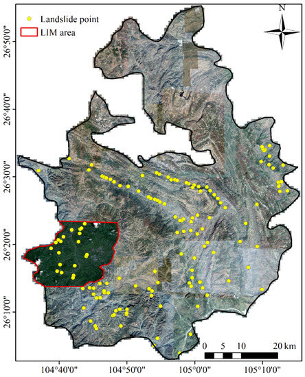 A landslide inventory map of Liupanshui City from 2019 was obtained. The Bijie landslide data are RGB images with a resolution of 0.8 m. To match the sample data, Google images from 2021 with a resolution of 1 m were selected. A total of 146 landslide points were obtained from the landslide data of Shuicheng County. Landslide points with indistinct geomorphic features and vegetation-covered surfaces were deleted. Simultaneously, new landslide points that have occurred since 2019 were added. Figure 8 shows the distribution map of the landslide points in Shuicheng County.
