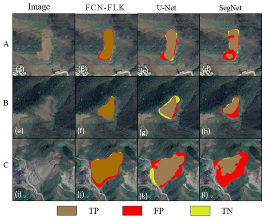 The FCN-FLK model was used to obtain landslide data from Shuicheng County to verify the generalization of the model. Meanwhile, the U-Net [44] and SegNet [45] models were trained using the training data and validation data introduced in Section 3.2, and the same VGG16 network as the FCN was used as the backbone network. The accuracy, recall, F1-score, and mIoU of the four models were calculated, as shown in Table 4.