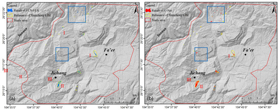 Landslide inventory maps of Fa’er and Jichang Towns using FCN-FLK and U-Net. (a,b) are the prediction results of FCN-FLK and U-Net, respectively. Blue boxes indicate false detections. Symbol I to III are the details of three remote sensing images, as shown in Figure 11.