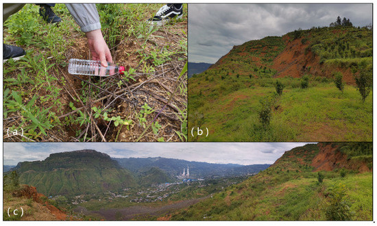 Field geological survey of Jianshanying landslide in Shuicheng County. (a) A crack; (b) the fracture surface; (c) the overall picture of the landslide.