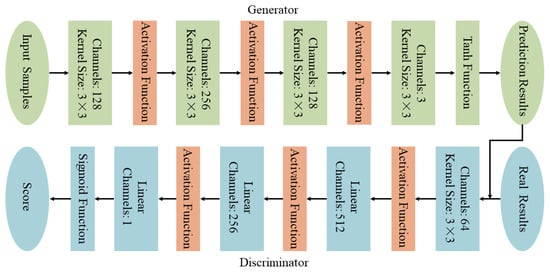In Equation (6), represents the prediction results, represents the real results, is an integer equal to 1, and represents the absolute value function. Therefore, this section proposes a new generator joint loss function. The specific formula is shown in Equation (7):