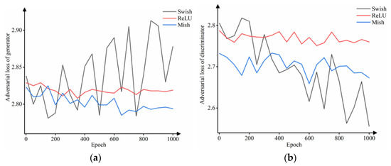 Using different activation functions to train 1000 epochs: (a) generator adversarial loss curves and (b) discriminator adversarial loss curves.