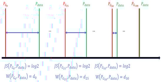 Therefore, the Wasserstein distance [25] is used to replace the JS divergence as the distance metric between and , as shown in Figure 5. For JS divergence, the distance between and , and the distance between and are both . Unless the parameters of the generator can be exactly updated to the parameters of in one step during training, the parameters of the generator cannot be gradually updated to and then gradually updated to , the training will stagnate. The advantage of using the Wasserstein distance is that even if and do not overlap or overlap very little, the Wasserstein distance still reflects how close they are. Therefore, for the Wasserstein distance, < < , is better than . can update the parameters to and then gradually update to until the distance between and reaches the minimum.