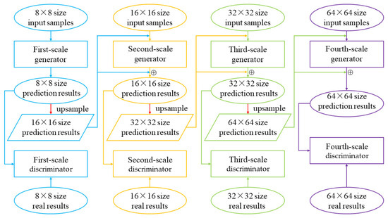 In Section 2, the single-scale prediction GAN model is used. Table 2 shows that over time, the long-term effect of the model prediction is obviously insufficient, and the shape and drift trend of the cloud cluster are still biased from the real results. It is difficult to directly learn the overall sample feature changes through a single-scale model. Therefore, this section cascades different scales of generator and discriminator networks to generate prediction images step by step from small to large. The model structure is shown in Figure 6.