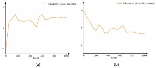 The discriminator no longer classifies the prediction results and real results but calculates the Wasserstein distance between the two. Therefore, in the training process, the adversarial loss between the generator and discriminator is no longer calculated by Log, and the final sigmoid function of the discriminator is removed. The loss curves of the improved model (GDL-GAN) training 1000 epochs are shown in Figure 7.