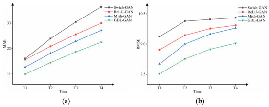 The change curves of four models in the next four times on (a) MAE and (b) RMSE indicators.