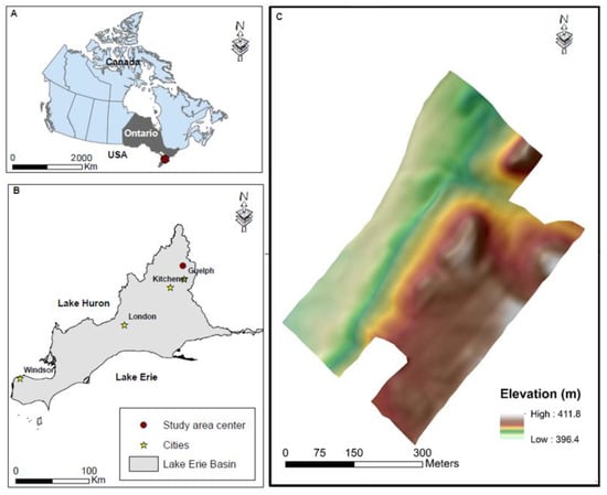 Maps showing the location of the study site in (A) southwestern Ontario within (B) the Lake Erie basin. (C) The study site with a topographic overview, where a hillshade raster was used beneath the elevation map to accentuate the topography.
