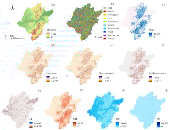 Map of conditioning factors: (a) elevation, (b) aspect, (c) slope, (d) curvature, (e) plan curvature, (f) profile curvature, (g) CI, (h) TRI, (i) TWI, and (j) SPI.