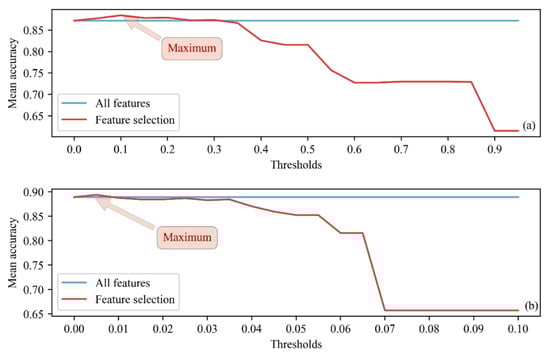 The utilized embedded method selects important features while the model is being trained. To perform EFS, the machine learning algorithms were preliminarily modeled, and the EFS process was implemented using only the training dataset. The models were trained using a 10-fold cross-validation technique that fully utilized the available data. In LR, the data should be standardized before modeling so that the regression coefficients can be compared. The key to EFS with the LR and RF models involved the determination of a threshold, and the features below this threshold value were discarded. The threshold was derived from the coefficients in LR and the feature importance in RF. We obtain the optimal threshold by drawing a learning curve that represents the change in the mean accuracy obtained after 10-fold cross-validation with different threshold values. The learning curve represents the variation in the results obtained by cross-validating the models with different quantitative features. The LR and RF learning curves are shown in Figure 5. The threshold ranges from 0 to the maximum coefficient or feature importance value. The feature selection results obtained with LR correspond to a threshold range of 0 to 0.25, showing better results than those obtained using all features; similarly, the RF feature selection results correspond to a threshold range of 0 to 0.01. The optimal threshold value for LR was found to be 0.11, and 32 features were selected. The mean accuracy of the features obtained by EFS (0.8844) was obviously higher than that for all features (0.8719). In addition, the RF model was determined to have an optimal threshold value of 0.004, and 28 features were selected. EFS likewise provided a higher mean accuracy (0.8961) than obtained when using all features (0.8891).