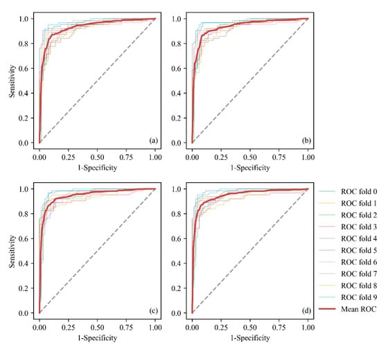 ROC curves of the LR and RF models obtained through 10-fold cross-validation: (a) all features of LR, (b) EFS of LR, (c) all features of RF, and (d) EFS of RF.