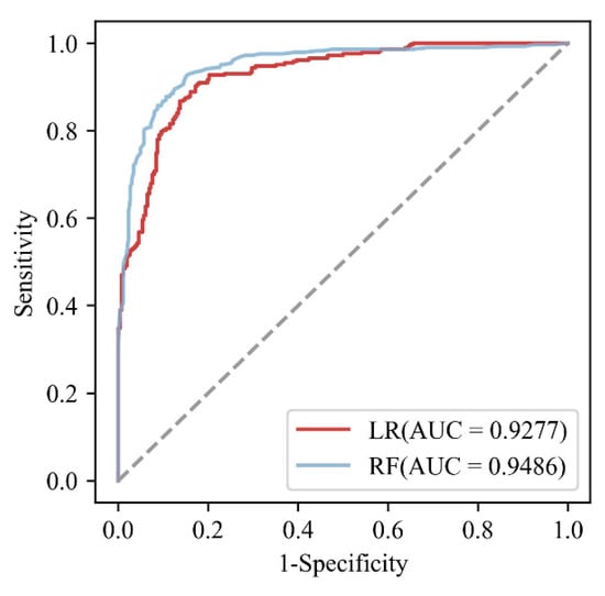 The test datasets were used to estimate the predictive abilities of the two models. The ROC curves of the two models combining EFS illustrate the prediction rates (Figure 7). The ROC assessment of the LR model revealed an AUC value of 0.9277 for the prediction rate, and the accuracy of the LR model was 0.8634. The RF model exhibited better overall performance than the LR model, as reflected in its AUC and accuracy values of 0.9486 and 0.8834, respectively. In addition, the performance of the two models after feature selection was compared on the training set for ten-fold cross-validation versus on the test set (Table 1). The evaluation metrics of both the training and test sets were close. This means that the model not only fits the training set, but also successfully generalizes to the test set and achieves similar precision. Therefore, the model was not overfitted to the training set resulting in poor precision in the test set. Meanwhile, the model can maintain a stable performance under different data sets, indicating that the model is more tolerant to data variations with robustness.