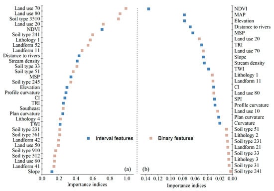 Importance of the selected conditioning factors based on EFS for the LR (a) and RF (b) models. The names of the conditioning factors are based on the following notation: cultivated land (land use 10); forest (land use 20); wetland (land use 50); water body (land use 60); tundra (land use 70); artificial surface (land use 80); sedimentary rock (lithology 1); intrusive rock (lithology 2); volcanic rock (lithology 3); melange (lithology 4); dark brown soil (soil type 31); bleaching dark brown soil (soil type 33); whitish soil (soil type 51); black soil (soil type 231); chernozem (soil type 241); moisture chernozem (soil type 245); hydragric paddy soil (soil type 512); fluvial soil (soil type 561); water (soil type 910); alkaline alluvial soil (soil type 3510); low-elevation plain (landform 11); low-elevation platform (landform 21); small undulating low mountain (landform 41); small undulating middle mountain (landform 42); and medium undulating middle mountain (landform 52).