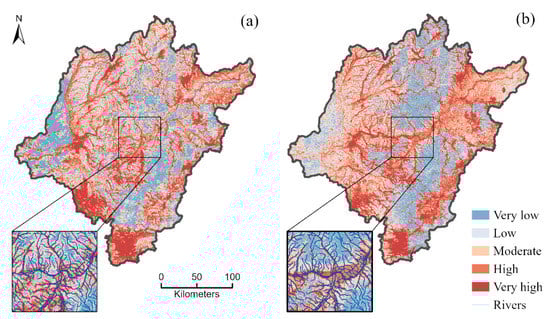 The flash flood susceptibility indices were calculated using the LR and RF models, and subsequently, FFSMs were generated in a geographic information system (GIS) environment. The flash flood susceptibility indices ranged from 0 to 1; high values indicate high flash flood probabilities. It is necessary to categorize susceptibility maps using appropriate classification methods to intuitively display flash flood susceptibility results. We divided the final susceptibility maps into five classes based on an approach used in other studies [,]: very low, low, moderate, high and very high susceptibility. Among the many existing classification methods, the quantile method [,,,] and natural breaks method [,,] are the most popular. We tested both methods to classify into susceptibility maps of LR and RF separately. In general, it is more reasonable for considerable flash flood points falling into high or very high susceptibility areas. Table 2 shows that fewer flash flood points are classified into the very low and low susceptibility classes by quantile method either in the LR or RF models. Hence, the quantile method is considered more accurate than the natural breaks method for the data used in this study. Figure 9 shows the final susceptibility maps obtained using the two models. There are obvious and large flash flood-prone areas in the southern and southwestern regions of the study area, and areas close to rivers also display high flash flood susceptibility.