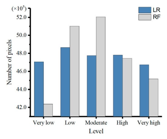 Moreover, the pixel-level statistics for the FFSMs obtained with the two models were calculated (Figure 10). The statistical results of the two models differ to some extent. Compared with that of the LR model, the FFSM of the RF model exhibited more fluctuating pixel distributions for all classes. Extreme susceptibility classes, such as the very low and very high susceptibility classes, included fewer pixels, while the moderate and low susceptibility classes had the most pixels. However, the pixel counts of the two models were similar for the high-susceptibility class.