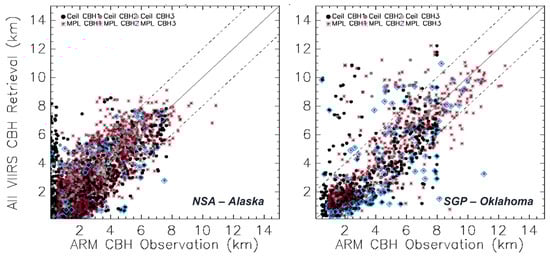 Another way to validate satellite information is to compare this data against ground-based measurements such as those of the Atmospheric Radiation Measurement (ARM) program, sponsored by the U.S. Department of Energy (DOE). We use ceilometer and micro-pulse lidar measurements from the ARM sites on the Northern Slope of Alaska (NSA in Alaska) and the Southern Great Plains (SGP in Oklahoma). Figure 5 shows a three-year comparison between VIIRS CBH estimates and ARM ground observations from ceilometers (black and gray) and micro-pulse lidar (red and brown). Multi-layer clouds can cause outliers, which are particularly notable in the SGP area, possibly having more complex cloud cases. Nighttime CBHs from nighttime cloud properties (Nighttime Lunar Cloud Optical and Microphysical Algorithm-NLCOMP using DNB) are colored in blue.