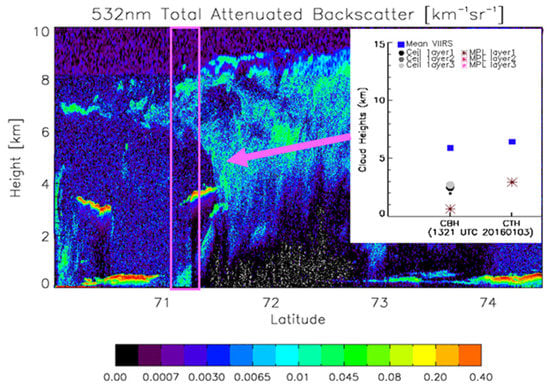 Comparison of S-NPP VIIRS CTH and CBH with CALIPSO lidar and ground ceilometer/lidar data for a multilayer cloud case near the ARM NSA site in Alaska as indicated in a pink rectangle (1321 UTC on 3 January 2016). Here, mean CTH and CBH from VIIRS (blue dots in the corner plot) only captured a topmost layer of the multilayered clouds, and ground ceilometer (black/gray circles) and lidar (brown/red asterisks) measurements reported lower-level layers.