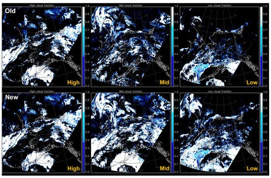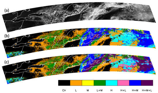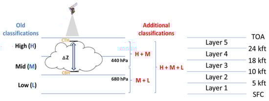 Furthermore, with the availability of CBH information, the CCL product can be rendered at the native resolution of the cloud property retrievals instead of on a coarser grid (e.g., 3 × 3 pixels, to provide fractional L/M/H coverage using CTH information alone). Examples of different thresholds used for each layer height range are shown in Figure 7. It is noted that two thresholds of 440 hPa (~6.5 km) and 680 hPa (~3–3.5 km) are used for the three-layer classification in the figure, following a definition of the International Satellite Cloud Climatology Project (ISCCP) [63].