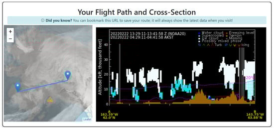 The website graphically displays a vertical view of cloud properties along popular aviation routes, including cloud boundaries, cloud conditions, and terrain. Turbulence and icing conditions from pilot reports (PIREPs) and NOAA Unique Combined Atmospheric Processing System (NUCAPS; [65,66,67]) temperature data are added to the cross-sections when available. If the NUCAPS temperature data are not available or invalid, NWP model data are used. As shown in Figure 11, the product is regularly adjusted and improved based on user feedback, and the cloud cross-sections help pilots understand how far clouds might extend toward the surface and thus better understand hazardous conditions in their path. Provided below is a quote from a NASA online news article [68] on this research effort including an interview message below from Adam White—an Alaska pilot, a government liaison for the Alaska Airmen’s Association, and a participant in the JPSS Aviation initiative: