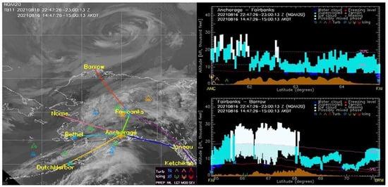 NOAA-20 VIIRS Infrared imagery (left) and cloud cross-sections along two flight paths between Anchorage and Fairbanks, and Fairbanks and Utqiagvik-Barrow, Alaska (right) used in the NTSB accident investigation which occurred around 2251 UTC on 16 August 2021 near Fairbanks.