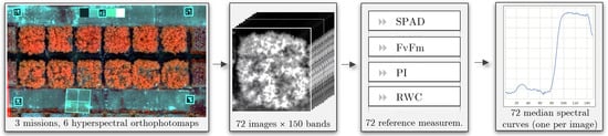 The dataset preparation procedure: 6 hyperspectral orthophotomaps, one for each flight for each set of 12 plots (left) were used to extract 72 hyperspectral 150-band images (middle left). The ground measurements of four parameters were performed for each plot (middle right). We extracted the spectral curves, individually for each pixel and aggregated across all pixels—see, e.g., the median spectral curve in the far right image.