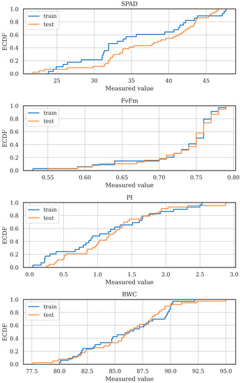 Empirical cumulative distribution (ECDF) of all parameters (SPAD, FvFm, PI and RWC) in the training and test sets.