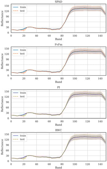Unbiased and fair validation of the emerging algorithms for the non-invasive estimation of the chlorophyll-related parameters from HSI is critical to allow the community to track the progress in the field, and to accelerate the practical adoption of such approaches. Since there are differences across the measurement methodology followed for each in situ parameter (the SPAD index, Fv/Fm, PI and RWC), we provide four separate training-test dataset splits, independently for each ground-truth chlorophyll-related parameter. Each split (i.e., for each parameter) is equinumerous, meaning that the number of plots is equal in the training and test subsets (36 HSIs with the ground-truth measurements captured for 36 separate plots of interest in both training and test sets). To be able to effectively quantify the generalization capabilities of the machine learning models trained and validated over such dataset splits, we stratified them according to the corresponding parameter’s distribution to maintain similar distributions in both training and test sets (Figure 3). The reflectance characteristics of all HSIs across all folds are rendered in Figure 4. They show that there is a high agreement in the spectral features captured for the training and test images. Hence, the test set indeed resembles the characteristics of the training data and may be used to quantify the generalizability of the data-driven algorithms.