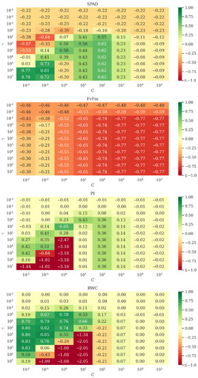 Our work is an interesting point of departure for further research. In this work, we did not intend to introduce a new, “ground-breaking” algorithm for estimating the chlorophyll level from HSI. There are, however, immediate next steps which should be performed to improve the performance capabilities of machine learning models, with the hyperparameter optimization being one of them. In Figure 6, we show how two most important hyperparameters of Support Vector Machines (C and ) affect their performance. Observing the results of the models optimized for each target parameter separately and gathered in Table 8, we can appreciate that the grid-searched Support Vector Machines significantly outperformed their default parameterization (Table 7). Therefore, optimizing the most important hyperparameters of other techniques would likely lead to their noticeable improvements.