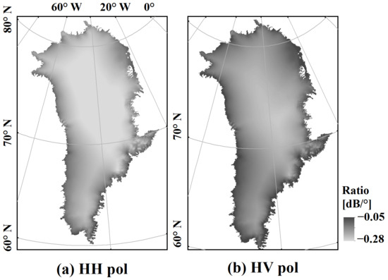 Without taking T into account, the ratio () variation of GrIS is shown in Figure 2 for both the HH and HV polarization channels. The absolute value of the ratio along the shoreline is generally smaller than those of the central ice sheet, suggesting that the backscatter coefficients of the central ice sheet are more sensitive to incidence angle variation than the coastal part. As for the different polarization mode, the overall absolute value of the ratio of HH polarization is bigger than that of HV polarization, which means that the HH backscatter coefficients are more sensitive to incidence angle variation than HV polarization. The ratio differs from −0.325 to −0.011 dB/°, with a mean value of −0.231 dB/° for the HH images. While for the HV images, the ratio ranges from −0.277 to 0.054 dB/° and is −0.166 dB/° on average. The incidence angle dependence of the backscatter coefficients for the HH images is stronger than for the HV images. Considering the incidence angle variation of Sentinel-1 EW mode is 18.9~47.0°, the incidence angle variation could lead to backscatter coefficient changes of 6.49 and 4.66 dB for the HH and HV images, respectively.