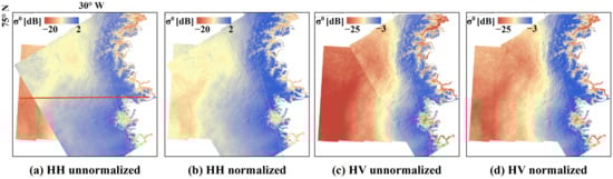 RMSEs of Sentinel-1 GrIS mosaics are shown in Table 3. For the HH images, RMSE of the image mosaics corrected by the incidence angle correction method was reduced by 0.34, 0.33, 0.32, and 0.37 dB in January 2020, April 2020, July 2020, and October 2020, respectively, relative to that corrected by the cosine-square method. For the HV images, the method performs slightly better, with a reduction of 0.04, 0.01, 0.05, and 0.04 dB RMSE, respectively, in the four periods.