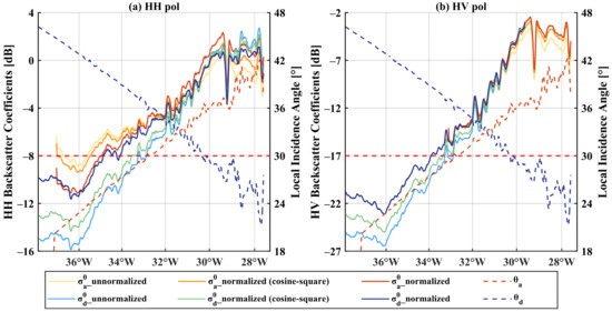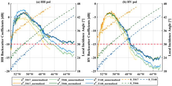 The backscatter coefficients profile along the red line in Figure 7a, covering the tracks 017, 046, and 148. The left vertical axis shows the backscatter coefficients’ variation and the right one shows the corresponding incidence angle change. EW1 of the HV images was removed. The red dashed line indicates the reference incidence angle of 30°.