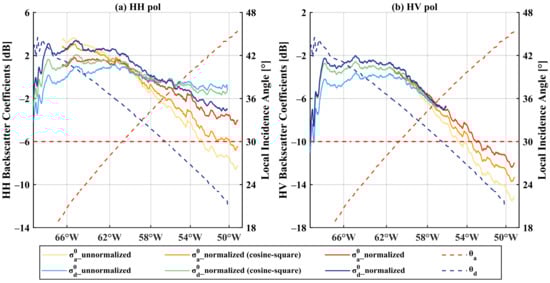 Compared to the cosine-square method, the improvement of the incidence angle correction method is more obvious for HH images than HV images. A possible reason is that the original backscatter difference between the HV ascending and descending images shown in Figure 4b and Figure 6b is much smaller than the HH images (Figure 4a and Figure 6a). The discrepancy between the HV ascending and descending images could be eliminated by both the cosine-square method and the incidence angle correction method, with similar improvements.