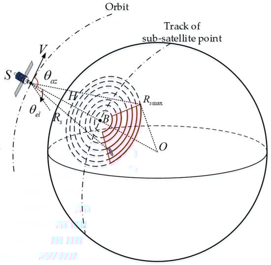 A geometric model of SBEWR located in LEO is shown in Figure 1. Where, is the SBEWR moving along the velocity , which is parallel to the ground, is the orbital altitude of satellite, is the center of the earth, is the radius of the earth, represents the sub-satellite point, and represent the azimuth and elevation angles of the beam, respectively. The beam cone angle is defined as . represents the slant distance of the current clutter range cell, and is the maximum detectable distance of the surface that can be covered by the beam of SBEWR, limited by the curvature of the earth.
