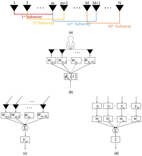 The detailed schematic diagram of FDA-Phase-MIMO radar array element synthesis and transceiver channel division is shown as Figure 2a. Figure 2b shows the transmitted subarray model with array element frequency division multiplexing and transmitting waveform by the m-th channel; unlike the conventional MIMO radar, each transmitted waveform of Phase-MIMO radar can be coherently accumulated with energy at the transmitter in the manner of phased array radar, and the transmitted beam is directional. As shown in Figure 2c, for signal reception, similarly, the received data of the m-th to the -th array element are synthesized, where the local spatial steering vector and Chebyshev weights are generally used as a fixed weighting method for the array element level data; the result of the data accumulation is used as the subarray level data of the m-th received channel for subsequent processing. Figure 2d shows the received subarray synthesis model; the subarray level data output from each receiver channel is output as the output power of the antenna system after weighted synthesis. The weights used for the synthesis between subarrays can be conventional weight, adaptive weights, or a combination of multiple weighting methods.