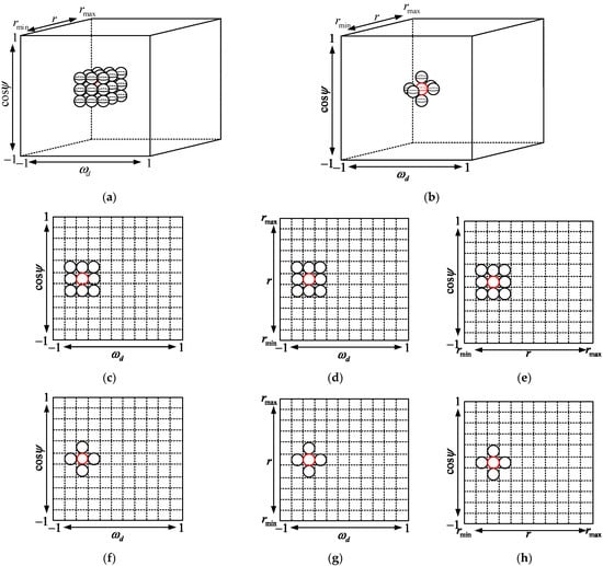 Method 3.d: The selected auxiliary channel dimension reduction structure is shown in Figure 5a,f,h. The 2D-JDL method is applied in the received beam-received Doppler plane where the target is located, and the 2D-GMB method is applied in two other 2D planes. The composition of the downscaling matrix is as follows: