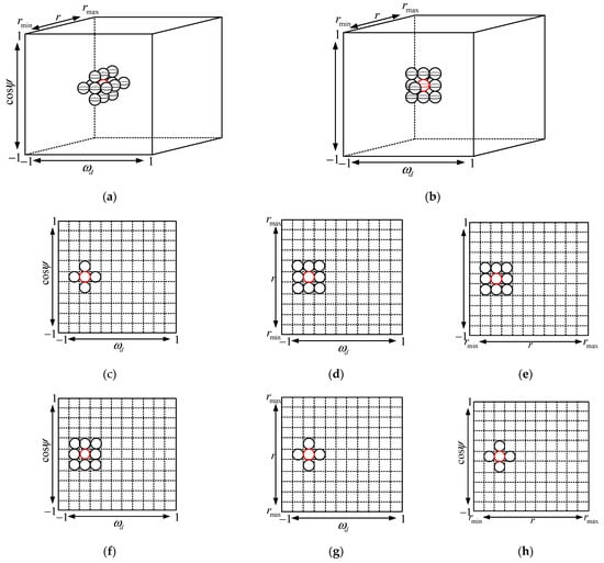 Method 3.a: 3D-JDL method: The principle of selecting auxiliary channels for the 3D-JDL method is shown in Figure 4a,c–e, where the target unit and its neighboring units are selected as auxiliary channels. This section sets the total number of auxiliary channels to (in Figure 4, the number of auxiliary channels is 3∗3∗3). The 3D steering vector of the target can be expressed as , , and , respectively. In order to select the appropriate auxiliary channel, the 3D reduction matrix should be expressed as: