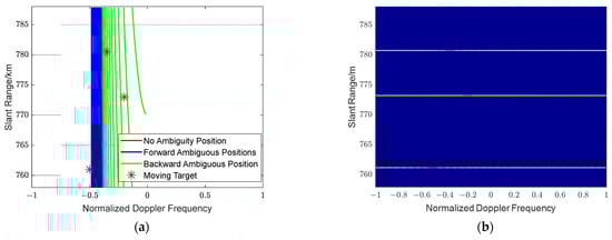 In Figure 6a, the red line represents the Doppler distribution of clutter receiving patches at different range cells within an unambiguous distance corresponding to the center of the beam, and each of the other lines represent the Doppler distribution of clutter receiving patches in different range ambiguous intervals. The forward range ambiguous positions are discrete, and many backward range ambiguous positions of the clutter receiving patches in the Doppler dimension cannot be distinguished; the distribution of the clutter Doppler dimension at different range ambiguous positions is consistent with the distribution of the ambiguous positions in the elevation angle dimension expressed in (5). From the distribution position information of clutter and moving targets in Figure 6a, it can be found that the faint moving target energy is often submerged in the clutter due to the very large amount of range ambiguous position energy of SBEWR spreading severely in the Doppler dimension.