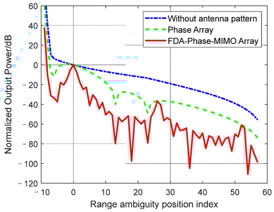In Figure 7, the power between each range ambiguous position and CUT is shown in the blue line. It can be found that the clutter energy of the backward ambiguous position is much higher than the energy from the CUT. For the phased-array radars with planar arrays, due to the modulation of the regular beam gain in the elevation dimension, the power is shown in the green line, and for the planar array of FDA-Phase-MIMO radar, by the joint modulation of the elevation dimensional and transmitting carrier frequency directional gain direction, the ambiguous position power is shown in the red line.