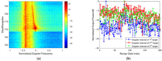 Output power spectrum for FDA-Phase-MIMO SBEWR after method 2: (a) Range-Doppler output power spectrum; (b) Normalized output power spectrum in different Doppler channels.