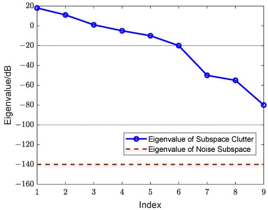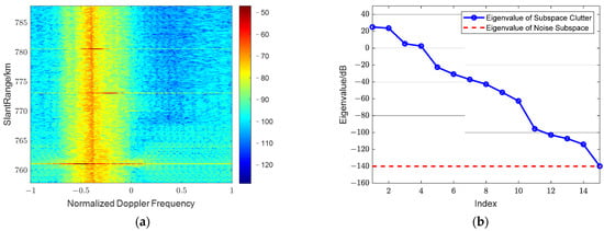 (a) The range-Doppler output power spectrum after using traditional elevation 3D-JDL-STAP; (b) The eigenvalue spectrum of reduced dimensional clutter covariance matrix.