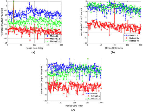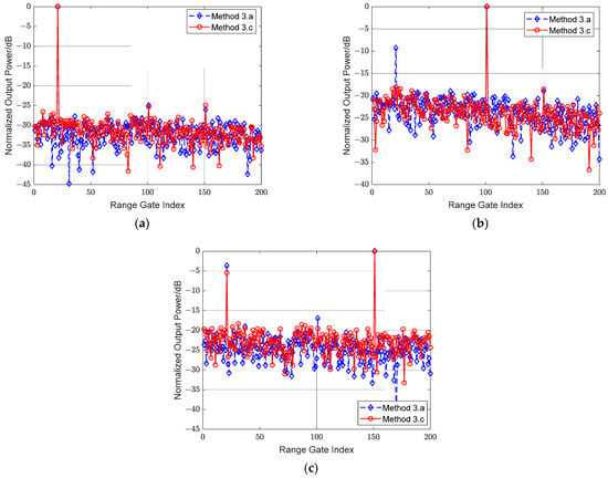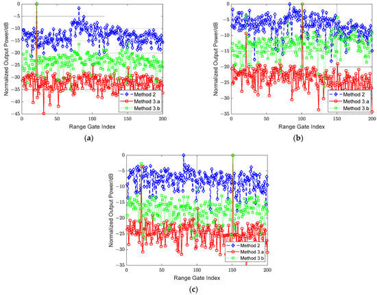Normalized output power spectrum in different Doppler channels by method 2, 3.a and 3.b: (a) Doppler channel of 1st target; (b) Doppler channel of 2nd target; (c) Doppler channel of 3rd target.