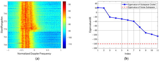 (a) The range-Doppler output power spectrum after using method 3.c; (b) The eigenvalue spectrum of reduced dimensional clutter covariance matrix.