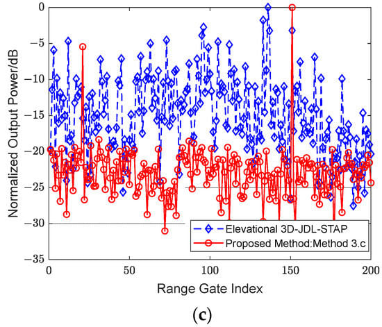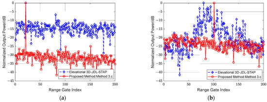 Finally, to further illustrate the advantages of the proposed method, the clutter suppression and moving target detection capabilities that could be obtained in the past by introducing the 3D-JDL-STAP method in the elevation-dimensional channel domain are used for comparison. The elevation-dimensional size of the antenna set up for this experiment is 3 m, and the number of its elevation-dimensional channels is eight. Figure 17a shows the R-D output power spectrum obtained by the traditional elevation-dimensional 3D-JDL-STAP method.