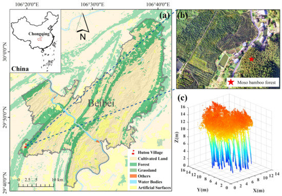 (a) The location of Hutou Village; (b) top view of the study site; (c) point cloud of sample plot after preprocessing.