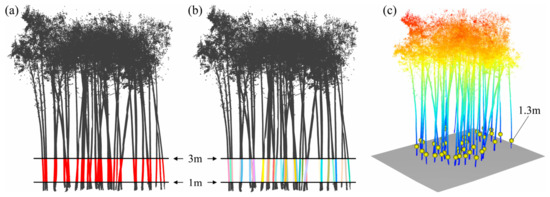 The B&F points are removed as much as possible based on the geometric features, including surface variation (SV) (Equation (2)) and verticality (V) (Equation (3)). The remaining culm points are to identify the positions of the individual Moso bamboos (Figure 3b), and then are clustered to generate the seed points at 1.3 m (Figure 3c).