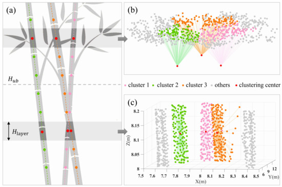 Schematic diagram of layer-wise distance discrimination segmentation: (a) the clustering centers of layers of individual Moso bamboos; (b) point clustering in a layer of canopy points; (c) point clustering in a layer of culm points.