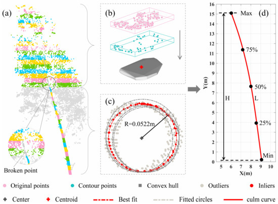 The culm axis is defined as a longitudinal curve in the center of a Moso bamboo culm [37]. It is actually a continuous curve in the 3D space, which can reflect the true length of the bamboo culm. As the line segment fitting is rather stiff, the B-spline curves are used to aptly characterize the longitudinal form of the bent bamboo culm. They are capable of fitting points in a segmented and smooth manner, and have the advantage of local control [38]. The five cross-section center points located at the minimum, 25%, 50%, 75%, and the maximum culm height of an individual Moso bamboo are selected as feature points to construct a 3D culm axis using cubic B-spline curves (Figure 6d).