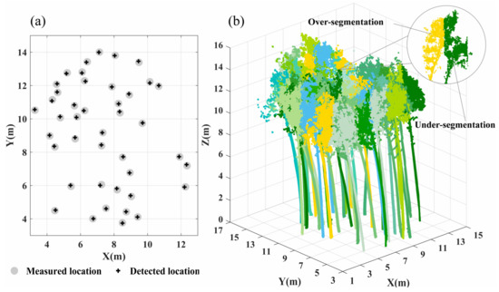(a) Measured and detected locations of individual Moso bamboos; (b) segmented points of individual Moso bamboos.